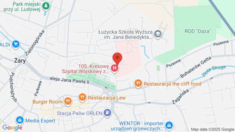 105. Kresowy Szpital Wojskowy z Przychodnią SP ZOZ w Żarach świadczy usługi medyczne, w tym badania z zakresu tomografii komputerowej. Placówka jest przystosowana do potrzeb pacjentów, oferując udogodnienia takie jak toaleta, parking oraz podjazd.