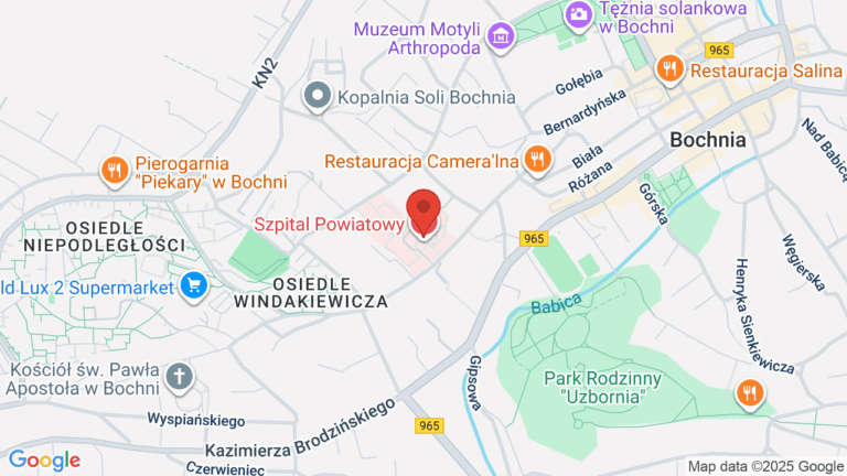 Szpital Bocheński – „Szpital Powiatowy” im. bł. Marty Wieckiej w Bochni oferuje różnorodne usługi medyczne, w tym pierwszą wizytę u onkologa oraz badanie tomografii komputerowej. Placówka jest zlokalizowana przy ulicy Krakowskiej 31. Szpital skupia się na zapewnieniu pacjentom dostępu do specjalistycznej opieki zdrowotnej w przyjaznym środowisku.
