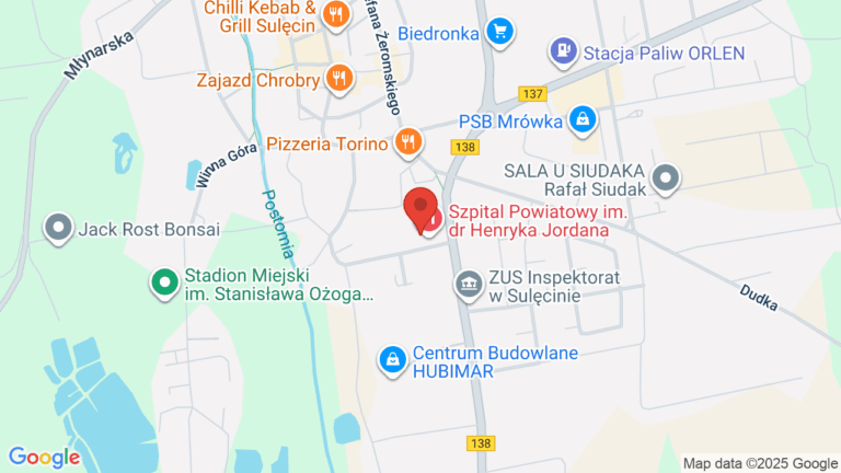 Szpital Powiatowy im. dr Henryka Jordana w Sulęcinie świadczy usługi medyczne, w tym pierwszą wizytę u onkologa oraz tomografię komputerową. Placówka zapewnia wygodne warunki, w tym toalety, parking, podjazd oraz windę. Szpital zlokalizowany jest przy ulicy W. Witosa 4.