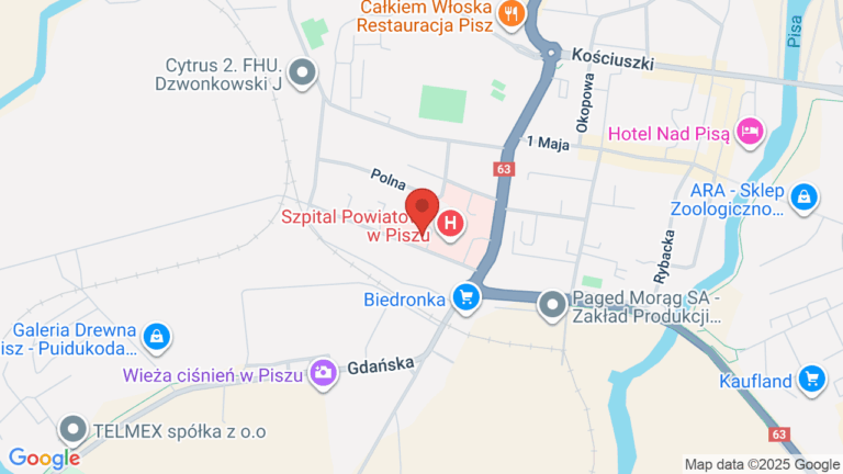 Szpital Powiatowy w Piszu oferuje usługi medyczne, w tym pierwszą wizytę u onkologa oraz tomografię komputerową. Placówka jest przystosowana do potrzeb pacjentów, zapewniając dostęp do toalety, parkingu, podjazdu oraz windy. Szpital znajduje się przy ulicy Sienkiewicza 2 w Pisz.