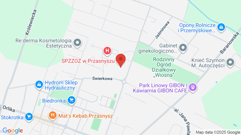 Szpital w Przasnyszu to placówka medyczna, która oferuje różnorodne usługi, w tym pierwszą wizytę u onkologa oraz badania diagnostyczne, takie jak rezonans magnetyczny i tomografia komputerowa. Została wyposażona w udogodnienia, takie jak podjazd, winda oraz toaleta, co zapewnia komfort pacjentom. Szpital znajduje się przy ulicy Sadowej 9 w Przasnyszu.