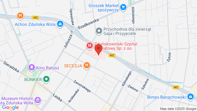 Zduńskowolski Szpital Powiatowy Sp. z o.o. znajduje się w Zduńskiej Woli i oferuje usługi medyczne, w tym pierwszą wizytę u onkologa oraz tomografię komputerową. Placówka jest wyposażona w udogodnienia takie jak toalety, parking, podjazd oraz winda, co wpływa na komfort pacjentów.